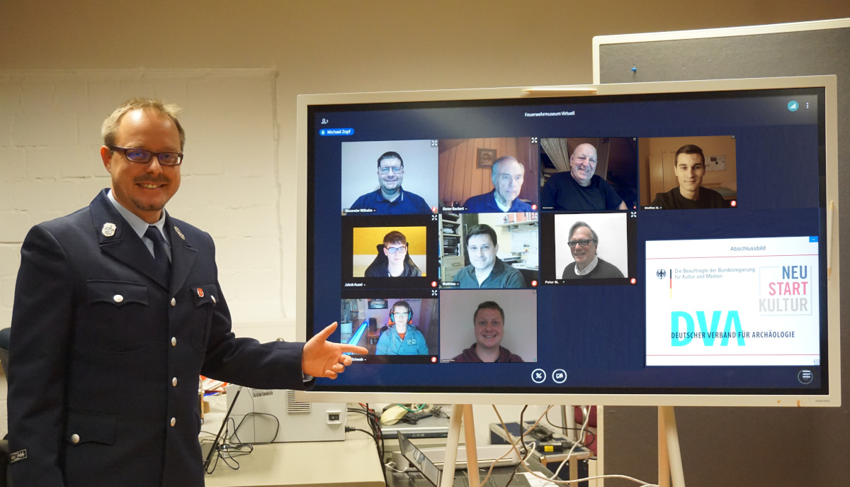 An der Realisierung der verschiedenen Teilprojekte wirkten viele aktive und passive Feuerwehrkameraden aus allen Löschgruppen mit ganz unterschiedlichen Talenten und Erfahrungen mit. Besprechungen liefen pandemiebedingt über ein Videokonferenzsystem. Auch die Abschlussbesprechung musste rein virtuell stattfinden (siehe Bild).