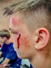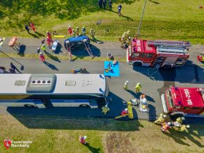 Das simulierte Szenario war sehr realistisch gestaltet: Drei PKWs waren in einen schweren Unfall verwickelt. Beim Eintreffen der Einsatzkräfte rauchte bereits eines der Fahrzeuge stark, in dem zwei Personen eingeschlossen waren. Ein weiteres Fahrzeug lag auf der Seite, mit einer eingeklemmten Person, während ein drittes Fahrzeug auf dem Dach liegend an einem Abhang zum Stillstand kam – auch hier mussten die Einsatzkräfte eine eingeklemmte Person befreien. Zusätzlich stellte ein Linienbus, der durch eine Vollbremsung mehrere Verletzte aufwies, eine weitere Herausforderung dar. Insgesamt acht Verletzte mit unterschiedlichen Verletzungsmustern galt es zu versorgen.