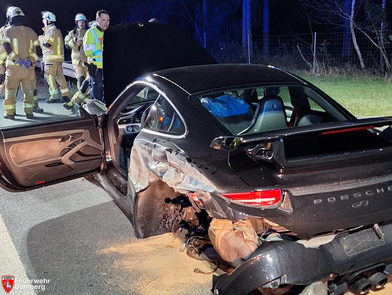 Die Einsatzkräfte erstellten mit dem Verkehrssicherungsanhänger eine Absicherung und lotsten den Verkehr an der Unfallstelle vorbei. Zudem wurde der Brandschutz sichergestellt und ausgelaufene Betriebsmittel mussten abgebunden werden. Außerdem wurde das abgerissene Hinterrad des PORSCHEs von den Einsatzkräften gesucht und etwa 250 Meter vom Standort entfernt aufgefunden und geborgen.