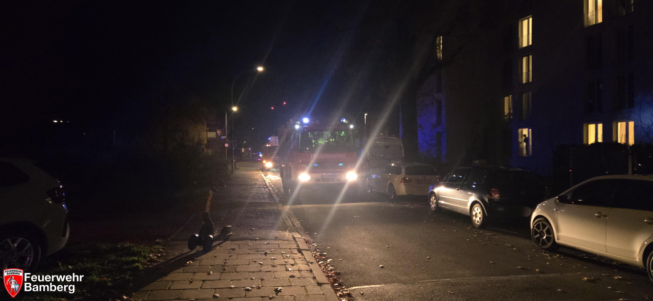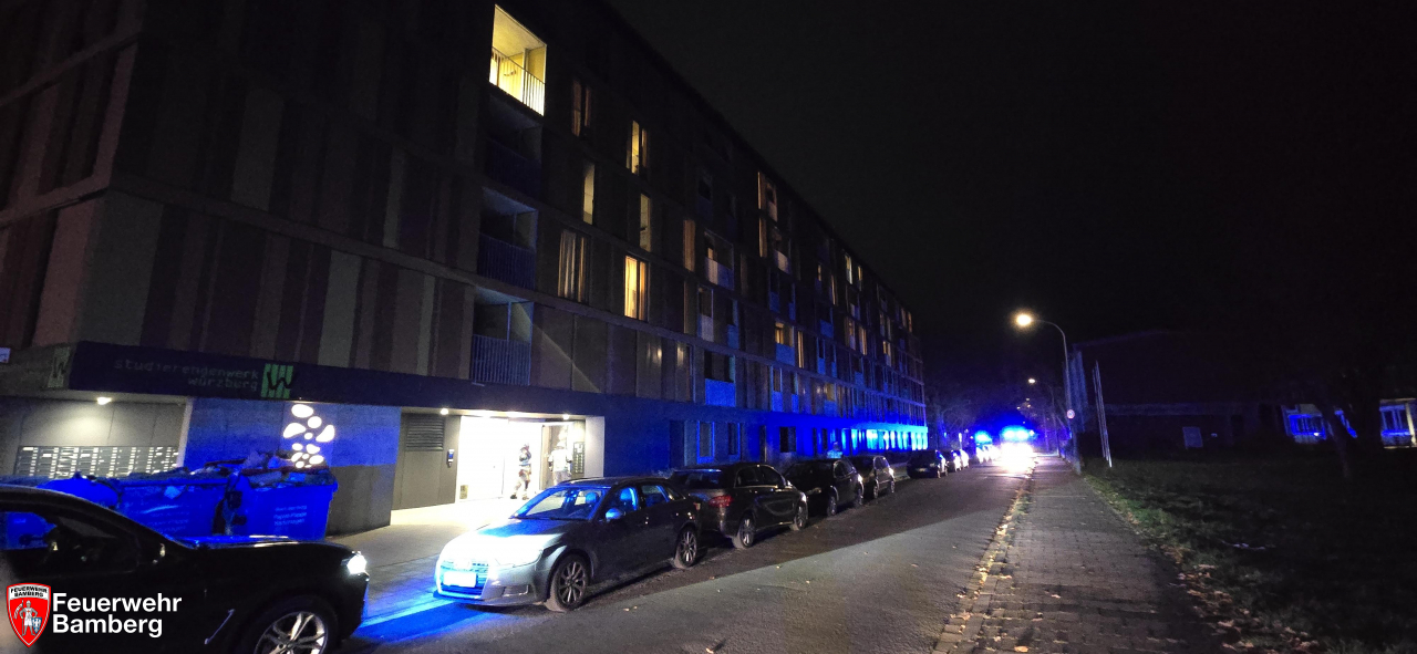 Am Abend wurde die Feuerwehr Bamberg zu einem Brand 'B4 mit großer Anzahl an Personen' alarmiert. Bei dem Objekt handelte es sich um ein Studentenwohnheim. Einer der Bewohner meldete, dass er sich aus dem Zimmer ausgeschlossen hätte, während im Inneren eine Pfanne mit Essen auf eingeschalteten Herdplatte stand. Alle Versuche einen Ersatzschlüssel zu organisieren scheiterten.